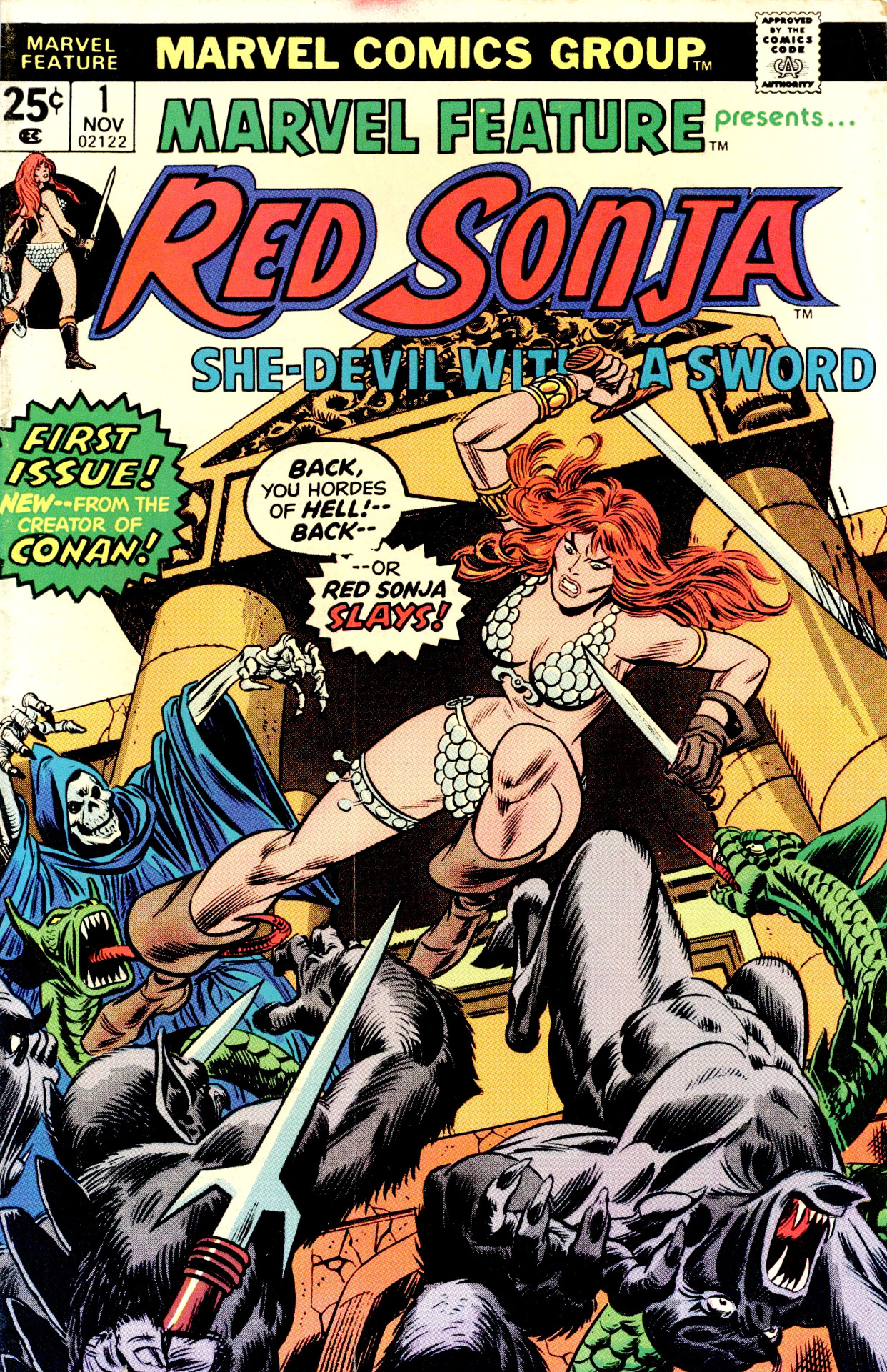 Red Sonja debutó en Conan The Barbarian #23 de Marvel en 1973, parcialmente basada en un personaje de un cuento de Robert E. Howard.